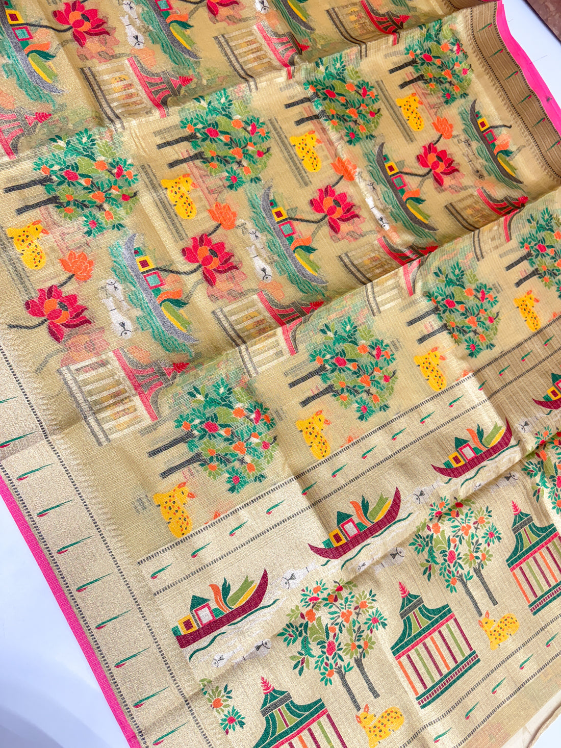 Experience the elegance of the Pure Jari Kota Pythanis Saree, crafted with fine Kota fabric...