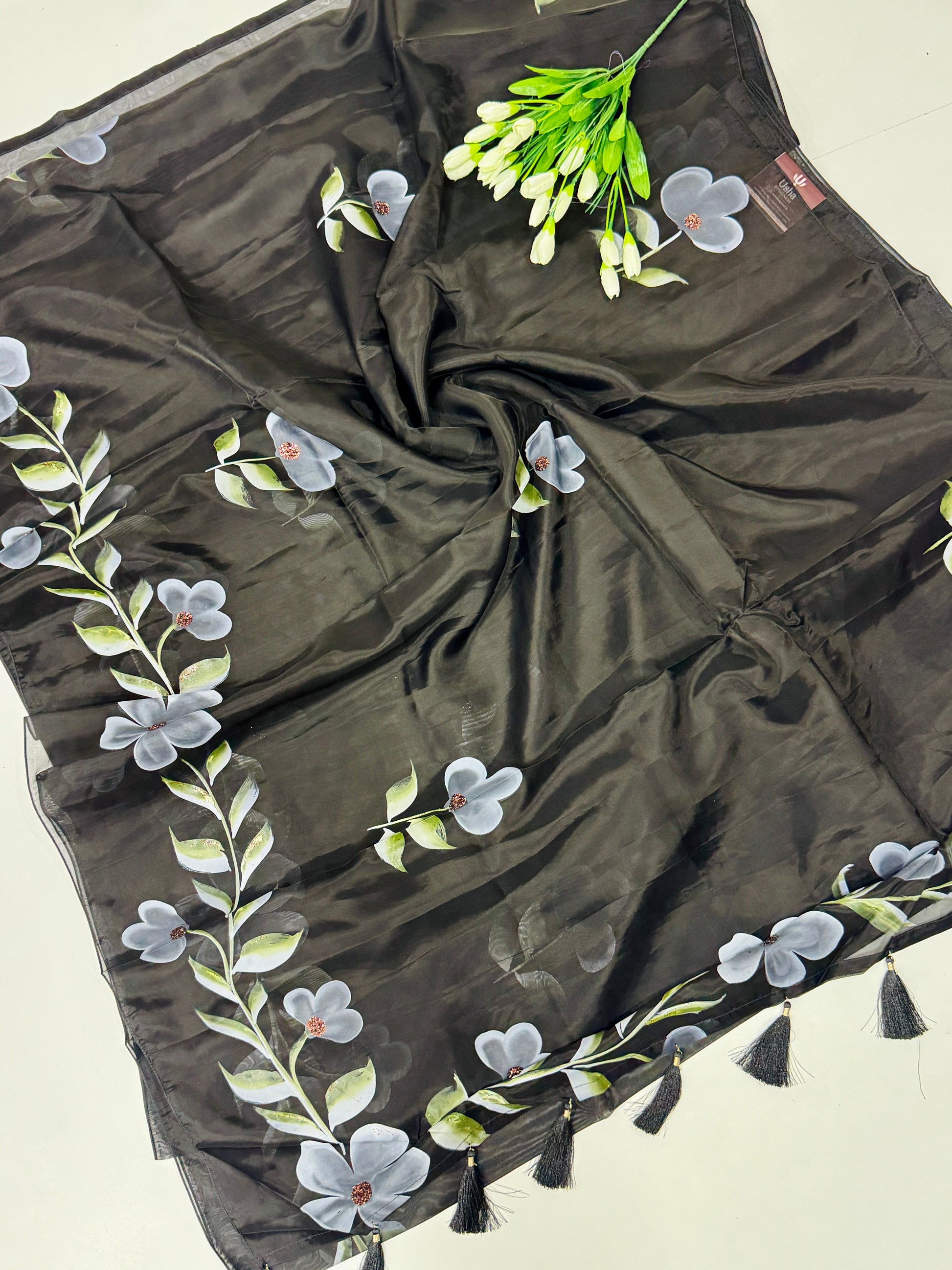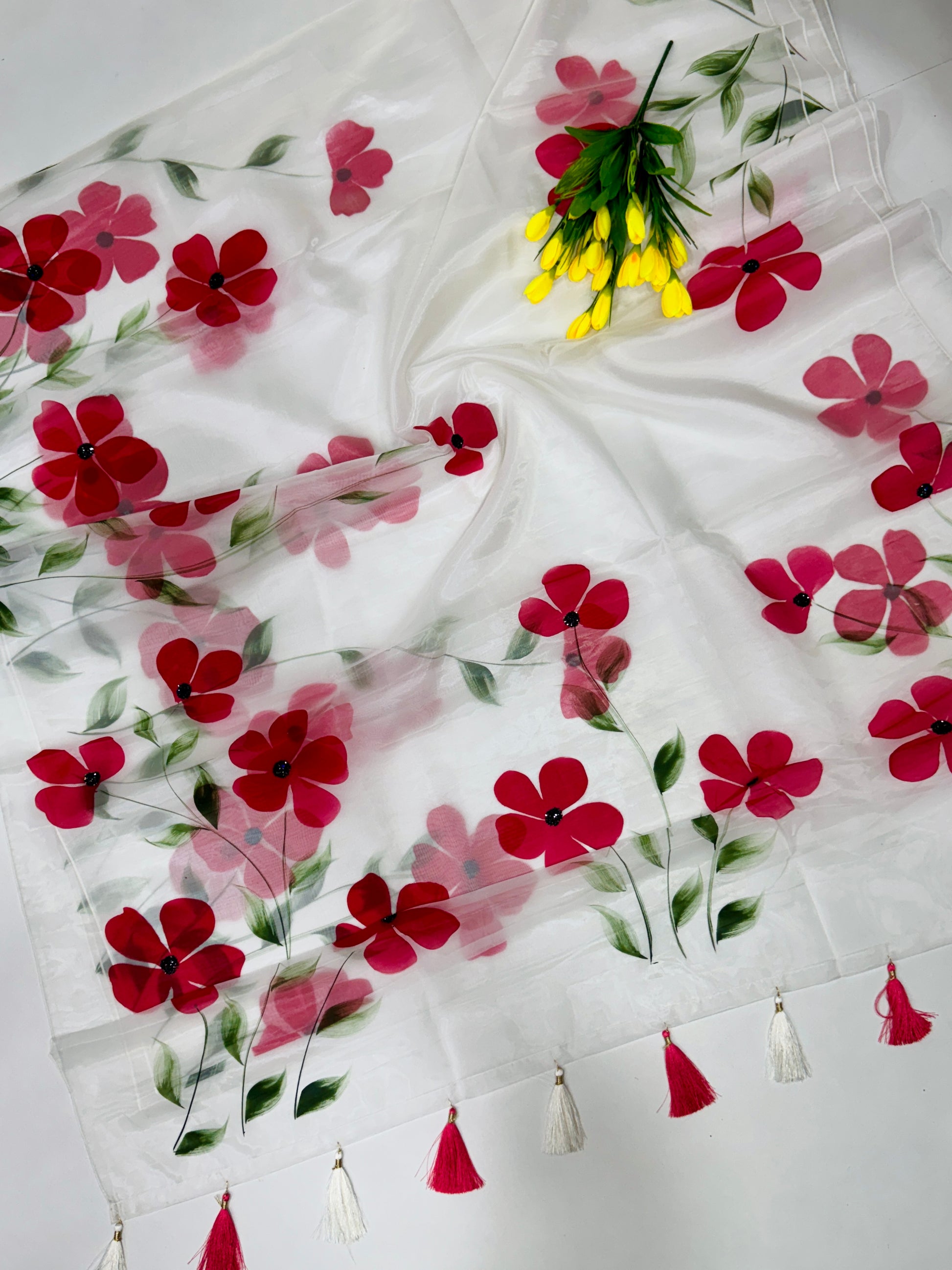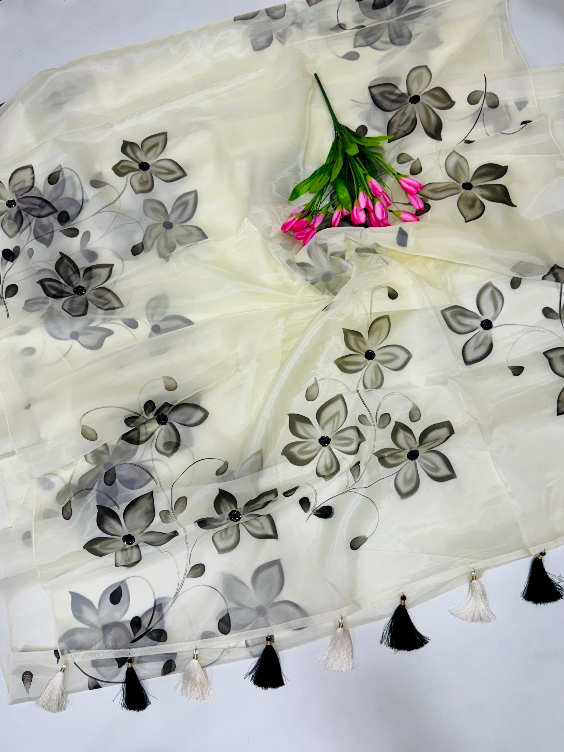 This glass fabric saree features exquisite hand-painted designs, blending traditional artistry with contemporary elegance. Crafted from high-quality glass fabric, it offers a lightweight and comfortable drape, perfect for formal occasions. The hand-painted details add a unique, artistic touch, making each saree a distinctive piece that reflects expert craftsmanship and refined style. Ideal for those seeking sophistication with a creative flair.