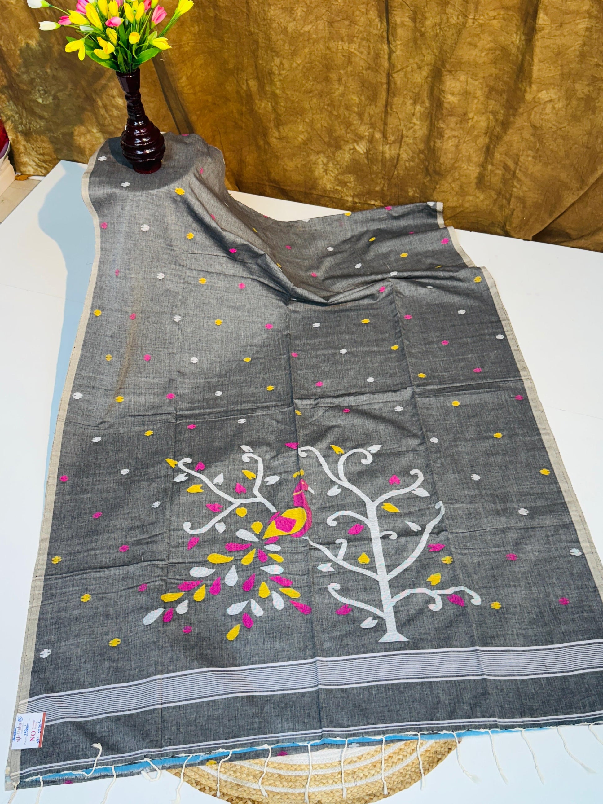 The Jamdhani Saree is a timeless piece known for its intricate handwoven patterns created using a supplementary weft technique. Originating from Bengal, this saree combines fine muslin fabric with complex geometric and floral motifs, showcasing expert craftsmanship. Its lightweight texture ensures comfort, while the elaborate designs add an elegant, sophisticated touch suitable for formal occasions and cultural celebrations. Perfect for those who appreciate artisanal heritage and refined style.