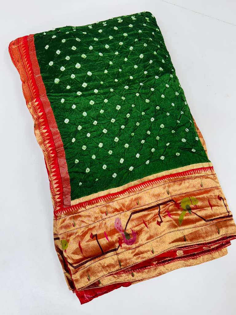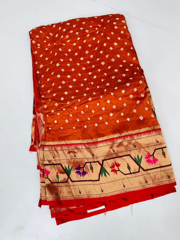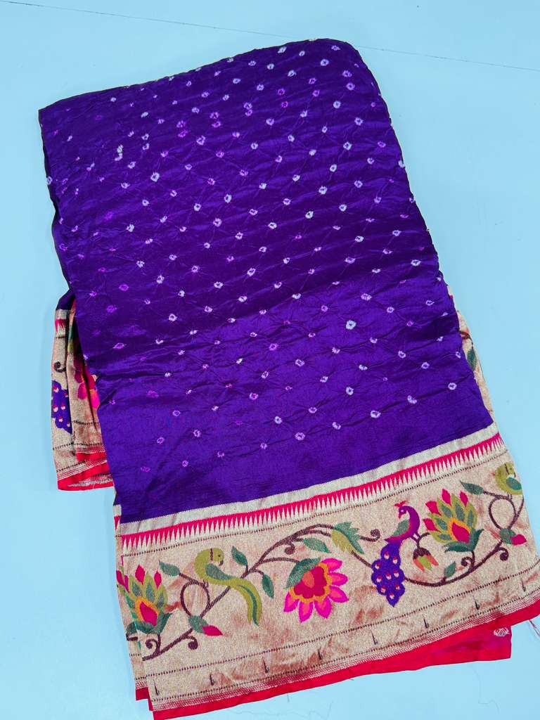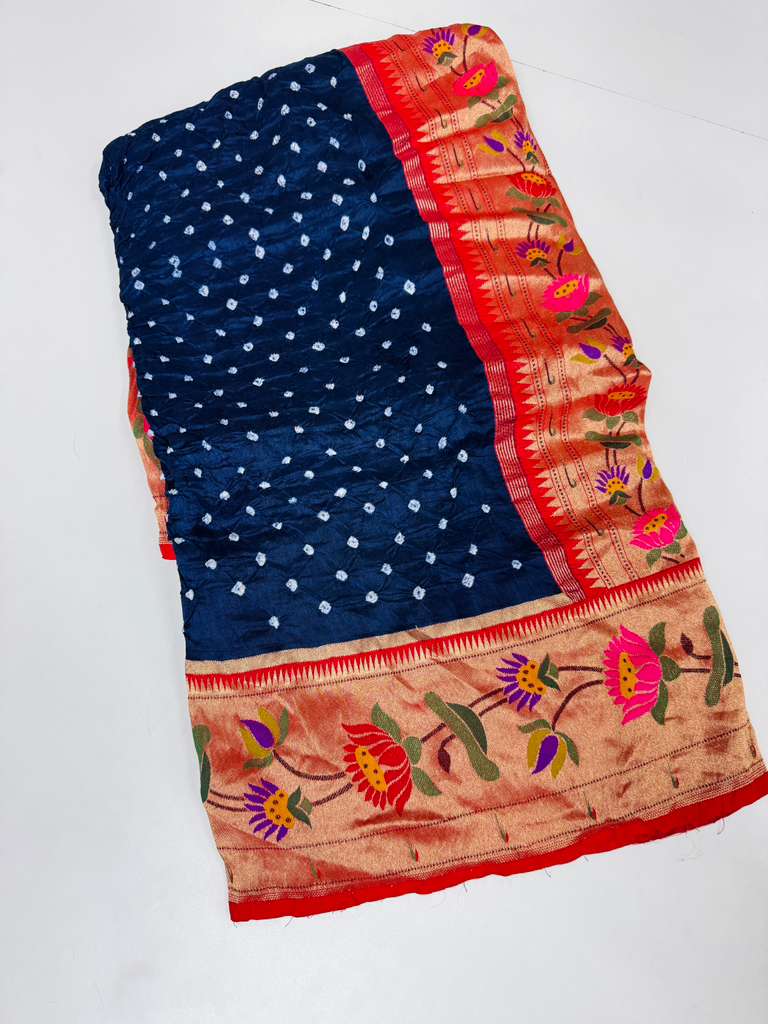 This Pure Hand Die Bandhini saree showcases exquisite traditional craftsmanship with its intricate tie-and-dye technique. Highlighted by a distinctive Pythani border, it blends rich heritage with elegant design, offering a timeless aesthetic. Perfect for formal occasions, this saree provides a graceful drape and vibrant patterns that enhance the wearer’s presence with understated sophistication. Ideal for connoisseurs appreciative of authentic artisanal textiles.